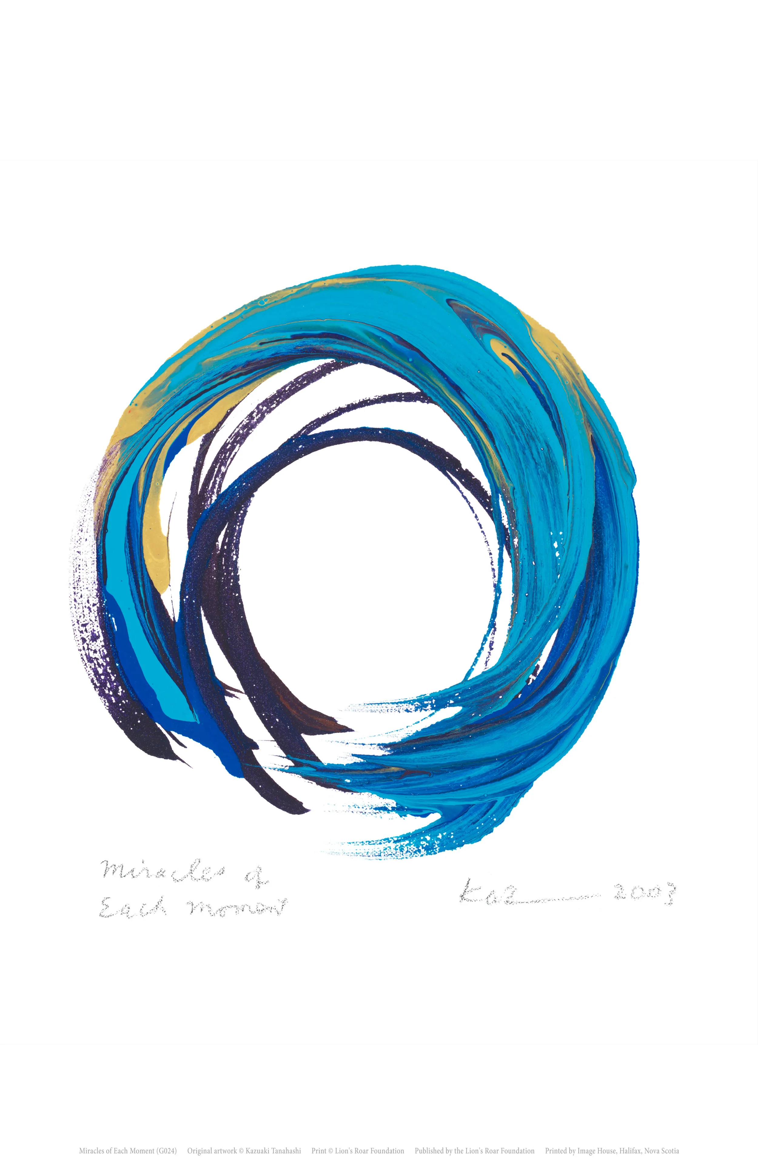 This enso, Miracles of Each Moment, was created by Kazuaki Tanahasi. You can purchase his work at brushmind.net. The enso is a symbol from the Japanese Zen Buddhist tradition.